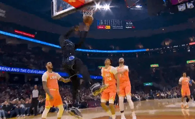 比赛的第一节,萨格斯反击接球单臂劈扣得手,魔术领先骑士到10分。